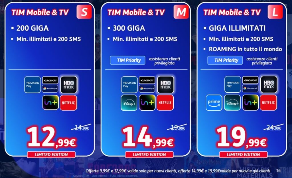 Scopri le nuove offerte TIM Mobile Minuti, SMS e Giga con la potenza del 5G. In più, puoi abbinare un’offerta intrattenimento per guardare Netflix, Disney+, HBO Max, Prime Video.